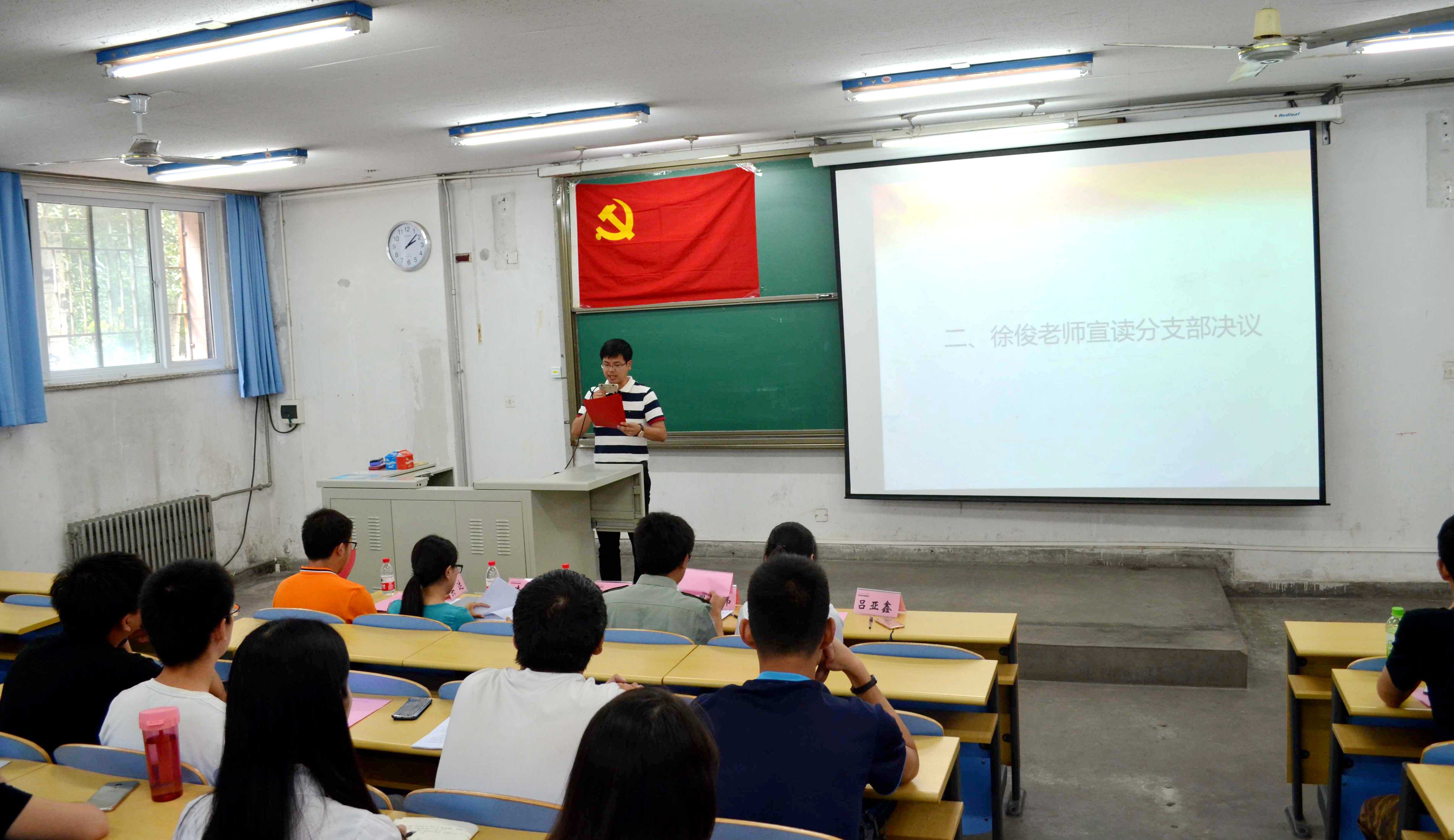 下午14:00,主持人关达老师宣布大会正式开始。首先,土建学院团委书记徐俊老师宣读了《土建学院本科生党支部分支部决议》,取消原支部的设置,重新划分了支部,并分别指定了团委老师进行指导。近两年我院严格秉承“成熟一个,发展一个”和“控制总量、优化结构、提高质量、发挥作用”的党员发展原则,党员总数逐年得到控制,质量也随之提高。原支部划分已经不能适应新形势的需要,因此重新划分支部,也是学院党建工作的一个重要基础工作。