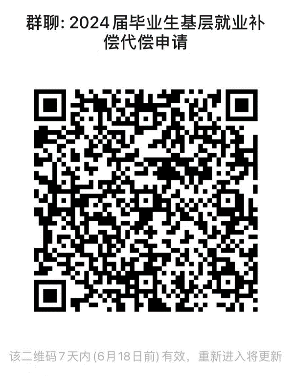 本次基层就业申报及审核工作均为线上,请申请2024届毕业生基层就业补偿代偿的学生扫码加入学校微信沟通群。如二维码过期,可联系辅导员老师。