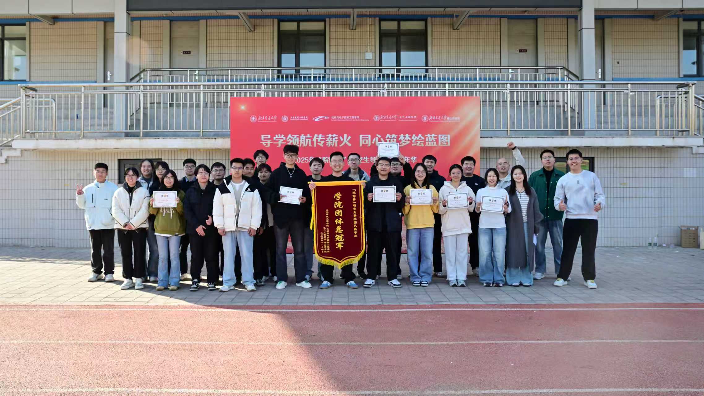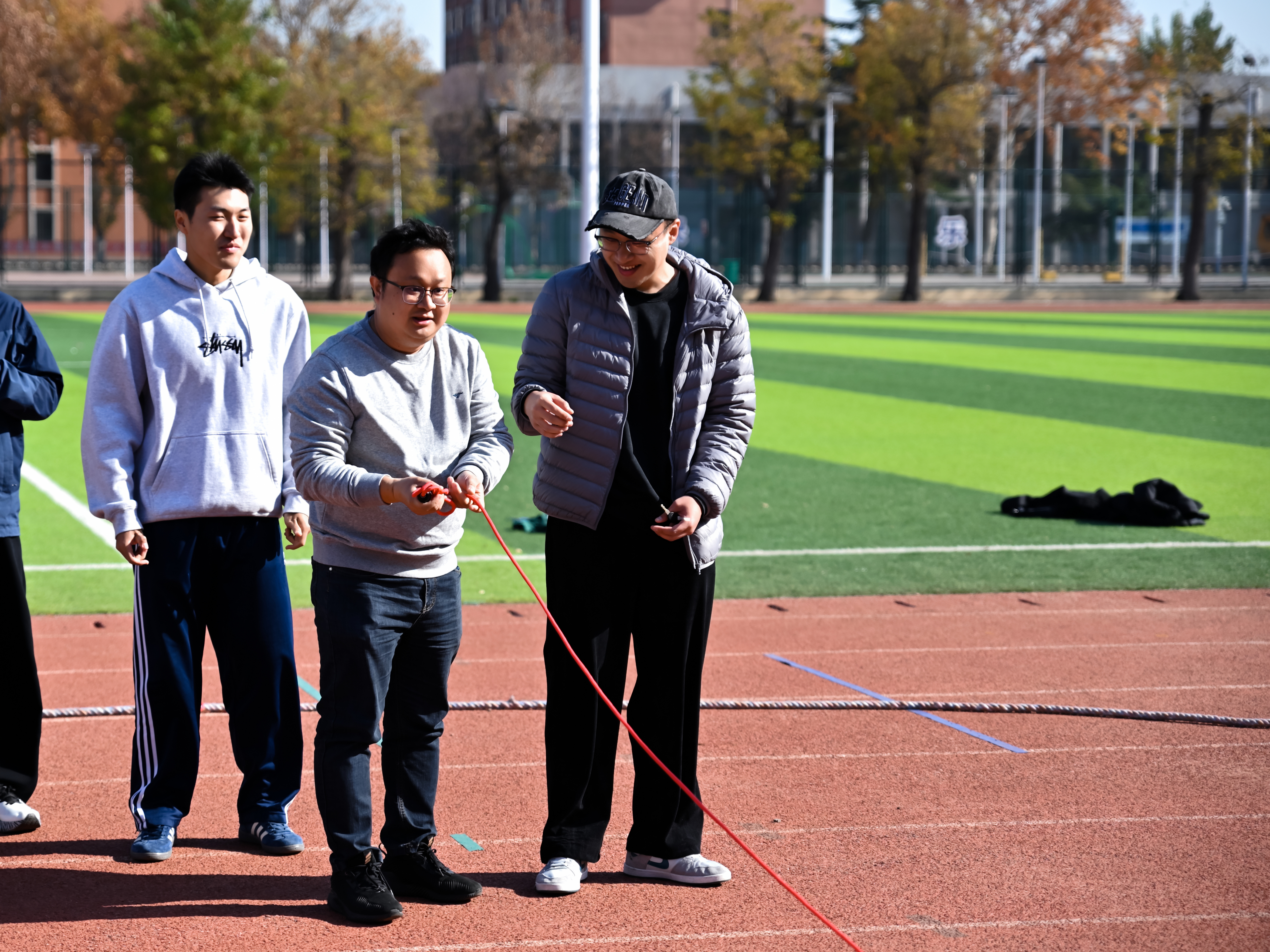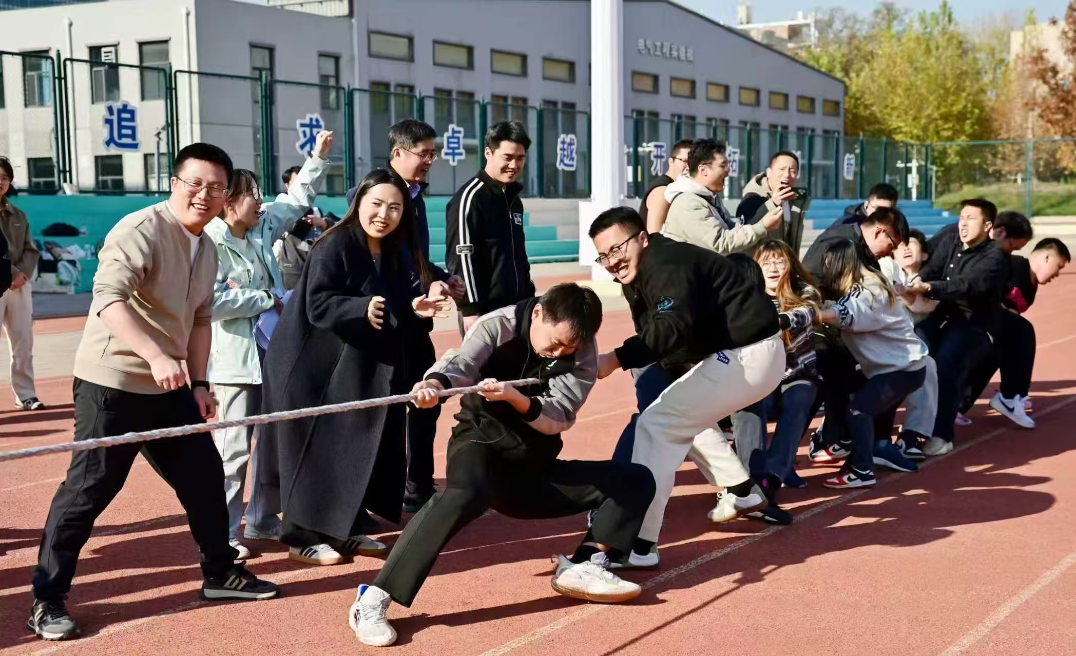 活动以“导学领航传薪火,同心筑梦绘蓝图”为主题,来自三个学院的9支研究生导学团队,共计90余名师生分别参加了跳大绳、套圈党建答题以及团体拔河三项趣味活动。套圈现场,参赛队员专注凝神,精准把控角度与力度,沉稳出手角逐目标;跳大绳环节,队员们身姿矫健、配合默契,在绳影翻飞间全力冲刺佳绩;团体拔河赛场更是气氛热烈,各队伍凝心聚力、劲往一处使,欢笑声与加油声交织回荡,充分展现了导学团队的协作精神与奋进姿态。